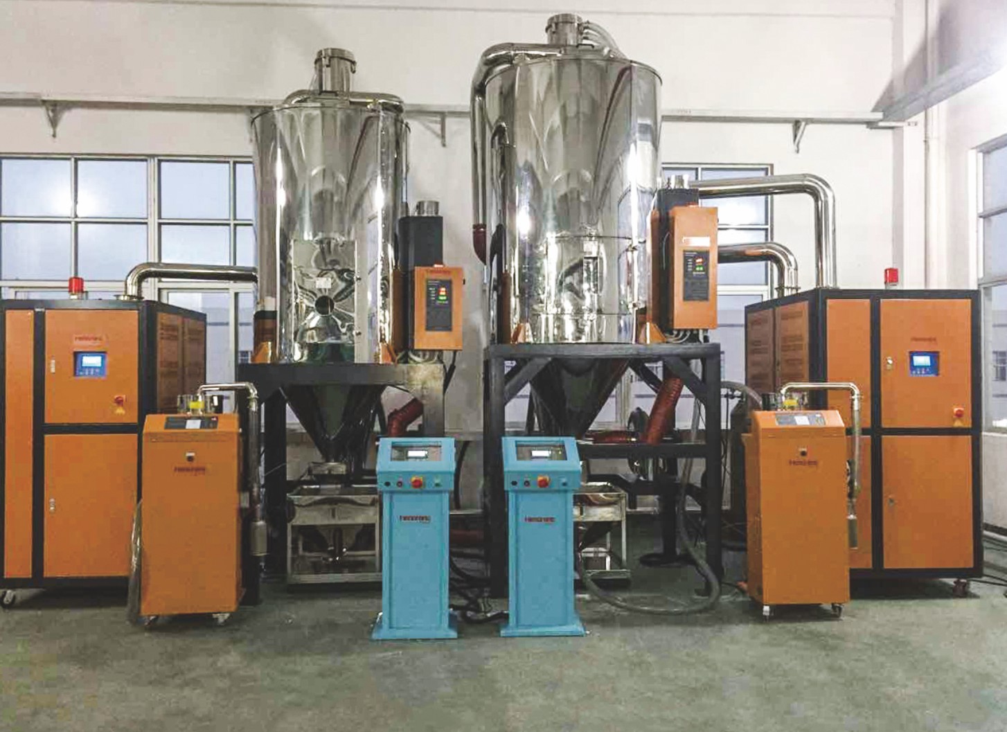 對于非吸濕性物料,可以使用熱風干燥機進行干燥。注塑機集中供料系統(tǒng)因為水分只是被物料與水的界面張力松散地約束,易于去除。此類機器的原理是,利用風扇來吸收環(huán)境中的空氣并將其加熱到干燥特定物料所要求的溫度,被加熱后的空氣經(jīng)過干燥料斗,并通過對流的方式加熱物料以去除水分。